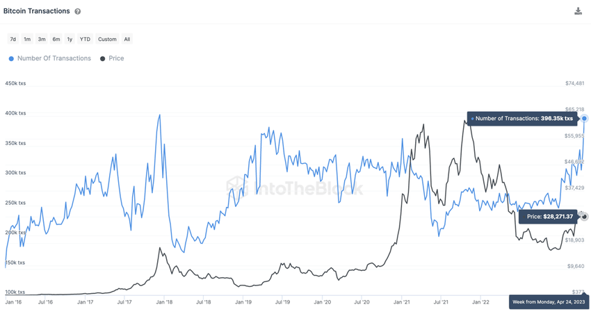 블록체인 데이터 분석 기업인 글래스노드는 지난 29일(현지시간) 비트코인 네트워크의 7일 이동 평균 거래가 42만6337.14건에 달했다고 밝혔다. 암호화폐 전문 매체인 우블록체인(Wu Blockchain)은 이를 비트코인 대체불가토큰(NFT) 프로토콜인 ‘오디널스 인스크립션’ 수요 증가와 관련지어 분석했다.