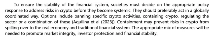 “금융 시스템의 안정성을 확보하기 위해 각 사회는 암호화폐를 제도화하기 전에 그 위험성을 확인하는 적절한 정책적 대응을 확정지어야만 한다. 구체적 방안으로는 특정한 암호화폐 활동의 금지, 암호화폐에 대한 제약 또는 규제 등이 있으며 이를 복수로 채택할 수도 있다. 암호화폐를 제약하는 것은 실물 경제나 전통적인 금융 시스템으로 영향이 넘어가는 것을 예방할 수 있다. 시장 통합성과 투자자 보호, 금융 안정 등을 위해서는 이같은 방안을 적절히 혼합하는 것이 필요하다.”