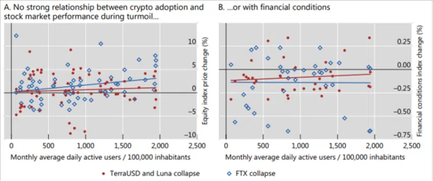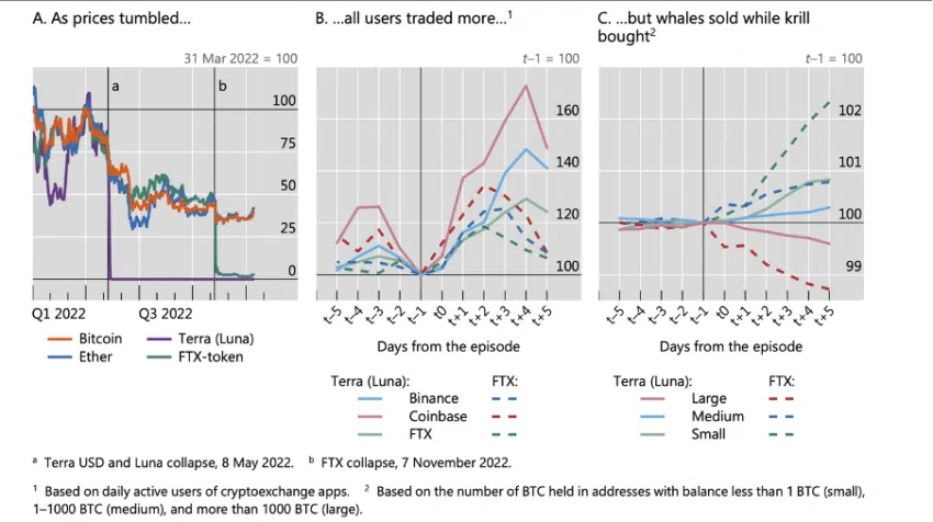 BIS는 테라의 폭락과 FTX의 몰락 당시 관련 소식이 전해지자 암호화폐 거래 앱 내 활동이 급증했음에도 불구하고, 대규모 거래자들은 급락 전에 비트코인 등 암호화폐를 개인 투자자에게 매도할 시기를 알고 있었기 때문에 “소규모 투자자를 희생시키면서” 거래할 수 있었다고 지적했다.
