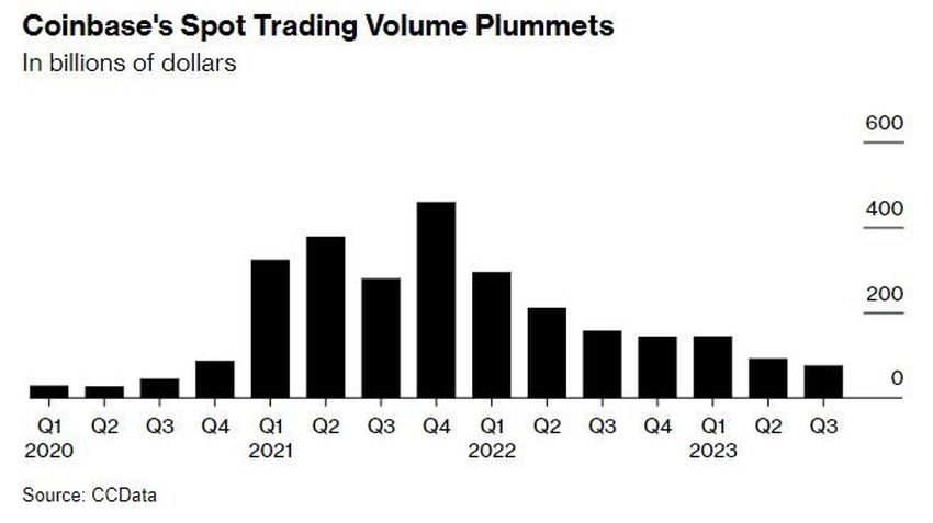 코인베이스 3분기 거래량이 기업공개 이후 최저치를 기록할 전망이다.