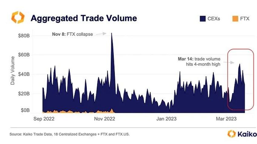 카이코는 가장 유동성이 높은 18개 암호화폐 거래소의 정보를 바탕으로, 암호화폐 거래량이 3월 14일 510억 달러를 기록하며 4개월 만에 최고치를 기록했다고 밝혔다. 이전 최고치는 FTX의 몰락으로 거래량이 800억 달러에 달했던 시기였다.