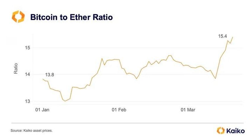 이번 카이코 보고서에서 가장 주목할 만한 통계 중 하나는 비트코인-이더리움 비율이 2022년 7월 이후 가장 높았다는 점이다. 비트코인이 나머지 시장을 얼마나 압도하고 있는지를 보여주는 지표이다. 3월 12일 이후 비트코인은 31% 상승한 반면 이더리움 18% 상승에 그쳤다.