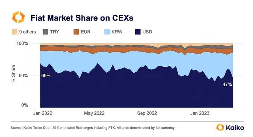 미국 달러는 중앙화된 암호화폐 거래소(CEX)내 법정화폐 점유율이 69%에서 47%로 감소하면서 타격을 받았다.