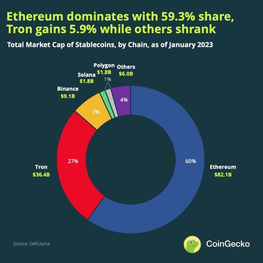 3월 6일 코인게코는 이더리움이 스테이블코인 시장에서 여전히 지배적 점유율을 점하고 있다고 밝혔다.