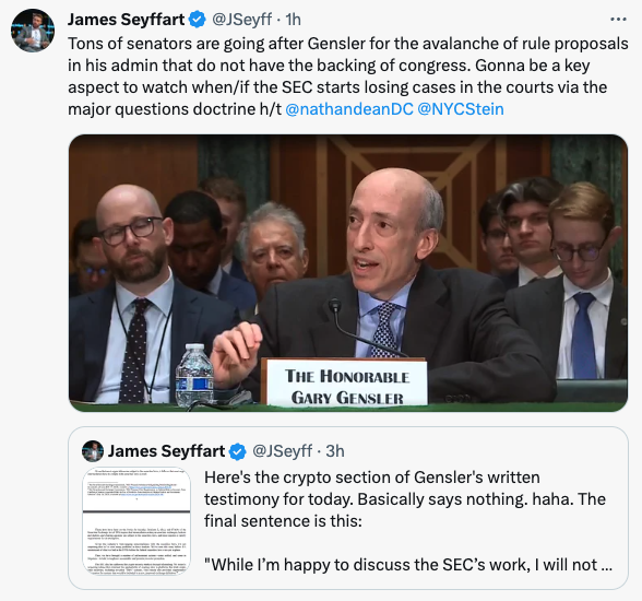이번 청문회와 관련해, 제임스 세이파트 블룸버그 애널리스트는 엑스(옛 트위터)를 통해 “수많은 상원의원이 엄청나게 많은 규제안에 대해 겐슬러를 공격했다. (SEC의 규제안은) 의회의 지지를 받지 못하고 있다”고 지적했다.