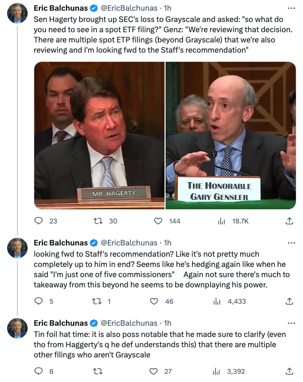 이 발언은 빌 해거티 상원의원(공화당⋅테네시주)이 “현물 비트코인 ETF가 승인되기 위해 어떤 서류가 필요하냐. 발행자로부터 어떤 답변이 더 필요하냐”고 질의한데 대한 답변이다.