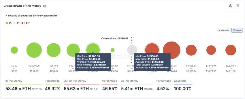 블록체인 분석업체 인투더블록(IntoTheBlock)의 GIOM(Global In/Out of the Money Around Price) 자료에 따르면 조정당한 이더리움 가격은 다소 위태로운 위치에 놓여있는 것으로 보인다.