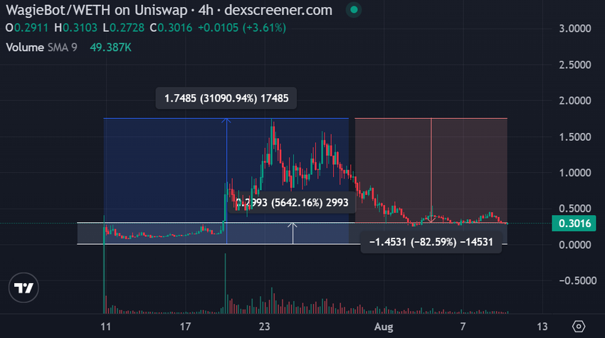 7월10일 탈중앙화 거래소(DEX)에서 출시한 와기봇(WAGIBOT)은 지난 2주간 3만1000% 급등, 1.74달러로 사상 최고가를 기록했다. 출시 가격보다 5500% 이상 상승하며 초기 투자자에게 큰 수익을 안겨줬다.