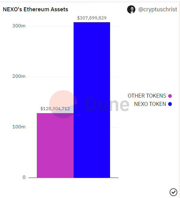 듄 애널리틱스(Dune Analytics) 개발자이자 암호화폐 데이터 전문가인 크립투스 크라이스트(CryptusChrist)에 따르면 넥소의 자산 4억3700만 달러 중 3억700만 달러가 자체 NEXO 토큰으로 구성된 것으로 알려졌다.