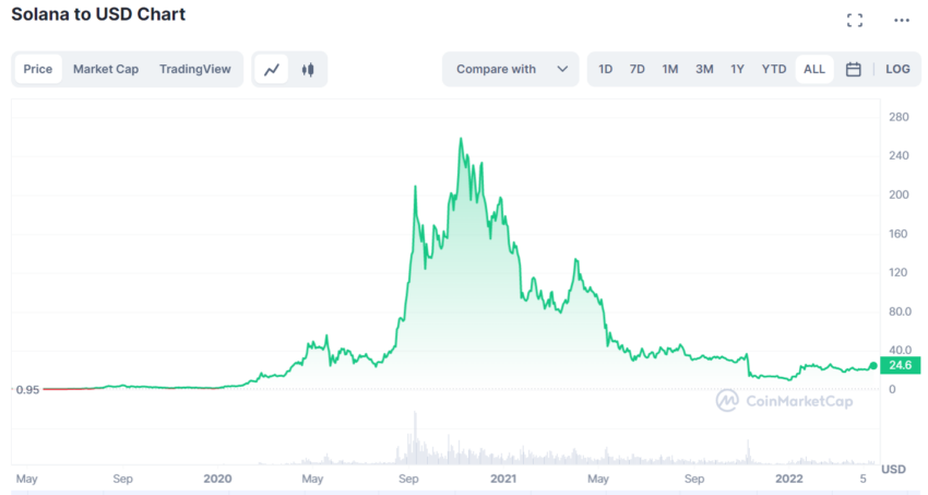 SOL는 올해 들어 약 150% 상승했다. 그러나 여전히 1년 전 가격인 100달러보다는 75% 낮은 수준이다. 또 2021년 6월 역대 최고가에 비하면 90% 이상 하락한 상태다.