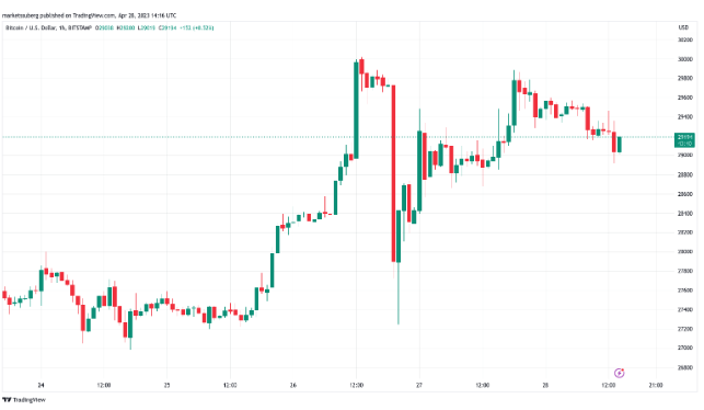 트레이딩뷰에 따르면, 거시경제 지표가 발표된 28일(현지시각) 비트코인은 2만9000달러 선을 오르내렸다. 시장에서는 PCE 지수 등 거시경제 지표가 비트코인에 이미 선반영해 있었다는 평가다.