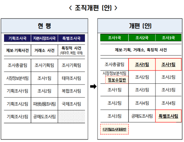 바뀐 조직개편안에서는 사건 성격에 관계없이 조사1국, 조사2국, 조사3국이 모든 영역을 다룬다. 보다 경쟁적인 환경에서 조사가 진행되는 셈이다. 다만 시장정보분석, 공매도 등의 분야는 별도의 특별팀을 편성했다.