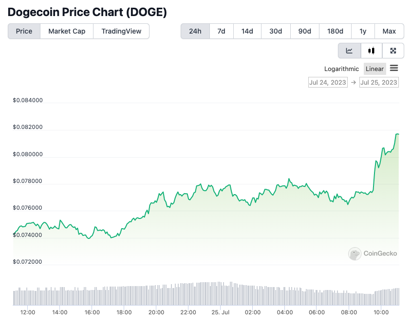 일론 머스크 테슬라 대표가 트위터의 이름과 로고를 ‘X’라고 바꿀 것이라고 발표하면서, 도지코인(DOGE)에 대한 기대감이 덩달아 올라, 이틀 연속 가격이 급상승했다.