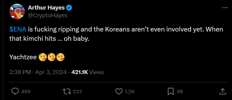 헤이즈는 지난 4월 3일 엑스(옛 트위터)에서 에테나에 대해 긍정적인 전망을 내면서 한국 투자자들을 언급한 바 있습니다. 당시 그는 “에테나는 (이미) X나게 끝내주지만, 한국인들은 아직 오지도 않았어. 김치 한 방이면…오, 베이비”라고 적었습니다.