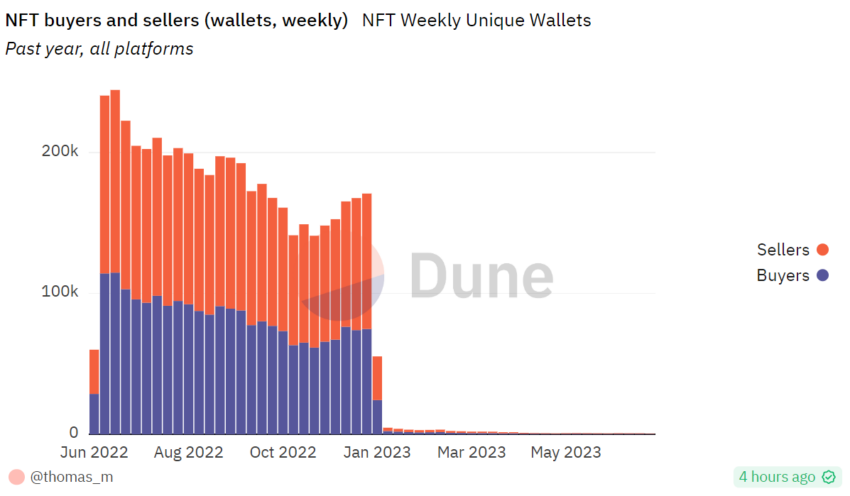 듄의 데이터에 따르면, NFT 순매수자와 순매도자 수도 대폭 줄었다. 지난주 매수자는 366명, 매도자는 441명이었다. 2022년 6월 마지막 주 매수자 3만1353명, 매도자 2만8756명에 비하면 100배 이상 감소한 수치다.