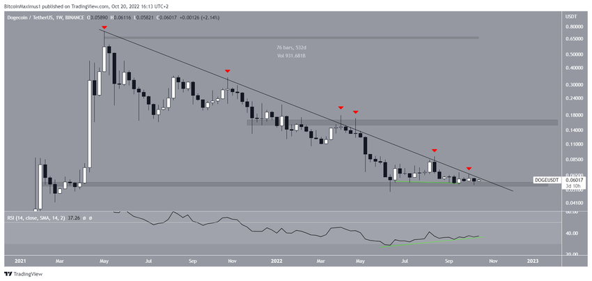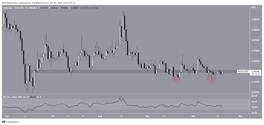 도지코인(DOGE) 가격은 2021년 5월 0.739달러로 사상 최고가를 기록한 이후 저항선 아래로 내려가고 있다. 하락 움직임은 지금까지 2022년 6월 0.049달러로 최저치를 기록했다. 당초 하락으로 0.056달러 수평 지지선 아래로 붕괴가 발생한 것으로 보였다. 그러나 가격이 튕겨져 나가 길고 낮은 심지를 만들어 이 구역을 지지대(녹색 원)로 검증했다.