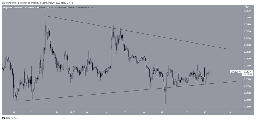 마지막으로 2시간 차트는 도지코인 가격이 대칭 삼각형 안에서 거래되고 있음을 보여준다. 대칭 삼각형은 중립적인 패턴으로 간주되며, 결정적이지 않은 가격 조치와 기술적 지표 판독에 완벽하게 들어맞다.