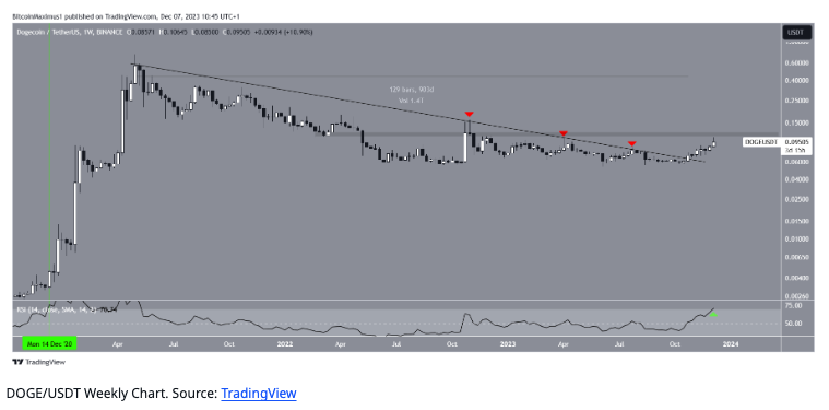 새로 알게 된 것: 기술적 분석에 따르면, DOGE 가격은 지난 10월 900일 이상 지속되던 하강 추세선을 돌파했습니다. DOGE는 이전에도 하락 추세선 돌파를 세 번 시도했지만 실패했습니다. 차트의 빨간색 아이콘이 그 시점들입니다.
