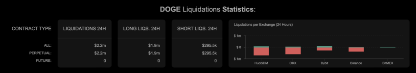 DOGE의 미결제약정 합계는 지난 3일간 하락하고 있었다. 이와는 별도로 190만 달러가 넘는 매수(롱) 포지션 청산이 시장에 약세를 더했다.