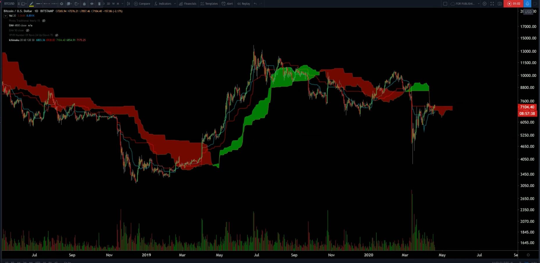 차트에서 알 수 있듯이, 비트코인이 이치모쿠 클라우드를 넘어 선 일일 가격 변동은 모두 눈에 띄는 성장을 이끌었다. 비트코인이 클라우드 위로 올라 섰던 2019년에는 4,000달러에서 1만4,000달러로 350%의 회복세를 보였다. 올해만 해도 비트코인의 클라우드를 넘어선 움직임은 20%의 가격 급등으로 이어졌다.