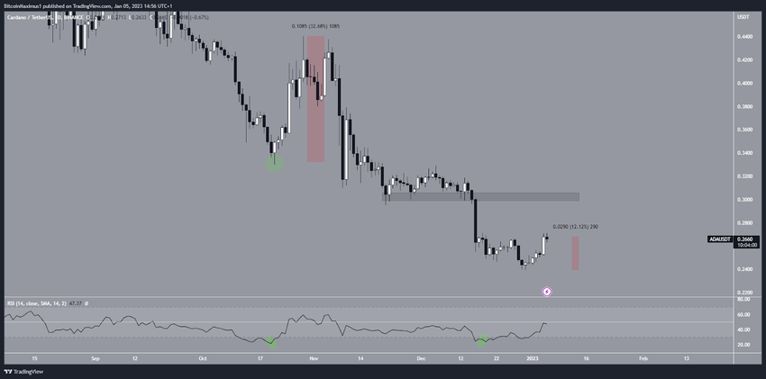 일일 시간대의 기술적 분석에 따르면 카르다노 가격은 지난해 10월 29일 최고 가격인 0.44달러에 도달한 이후 하락했다. 하락세는 12월 30일 0.24달러의 최저치로 이어졌다. ADA 가격은 이후 12% 상승하는 등 반등하는 기세였다.