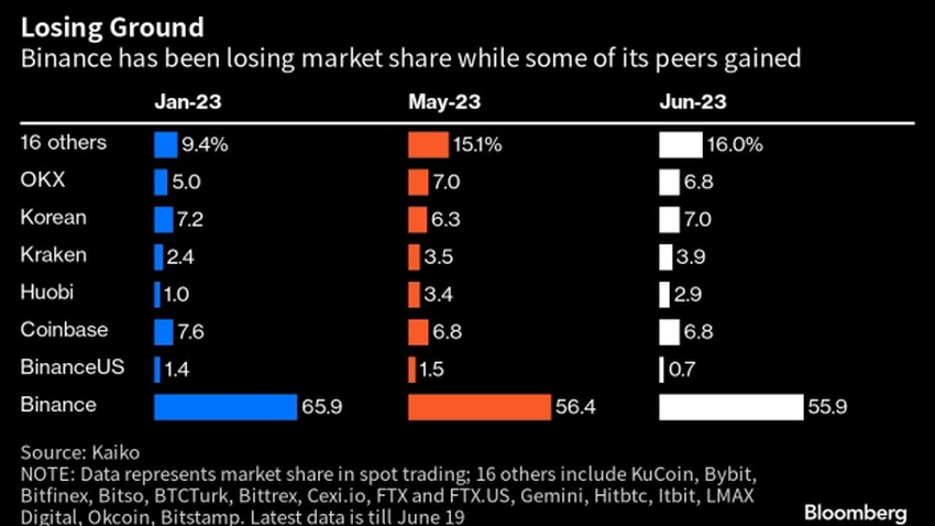 바이낸스 시장점유율이 끝을 모르고 하락 중이다. 여전히 세계 최대 암호화폐 거래소의 위치는 유지하고 있지만, 최근 몇 달간 시장점유율은 급격히 감소했다. 실제로 지난 1월 65.9%였던 시장점유율은 이번 달 55.9%까지 떨어졌다.