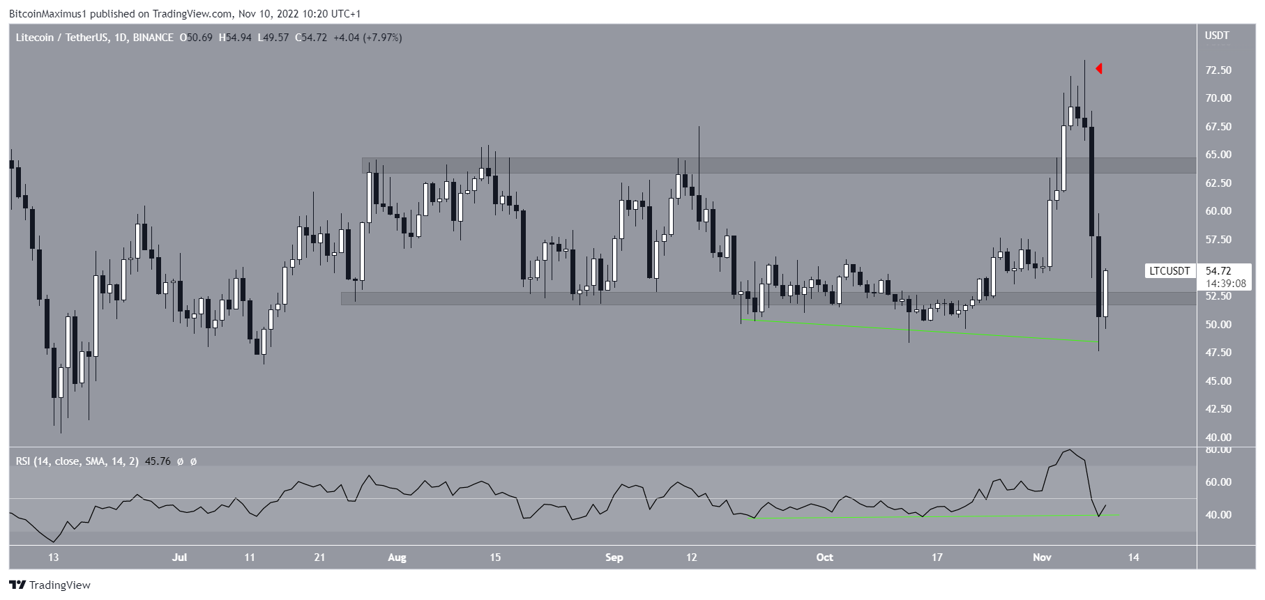 LTC 가격은 나머지 암호화폐 시장에 이어 11월 7일 최고 73.36달러에 도달한 이후 하락하고 있다. 이것은 매도 압력의 표시인 긴 양봉(빨간색 아이콘)을 생성했다.