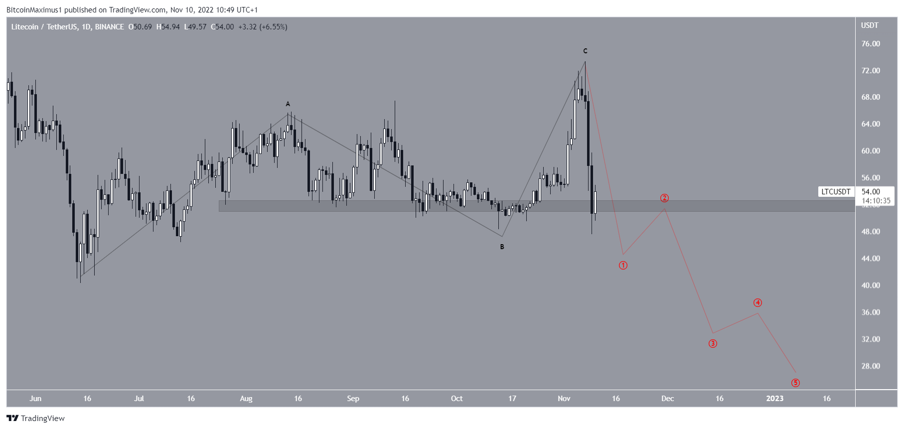 약세 의견은 이 상승이 조정 구조(검정색)를 보여준다고 말한다. 그렇다면 LTC 가격은 새로운 연간 최저치를 기록할 수 있는 새로운 하향 움직임을 시작한 것이다.