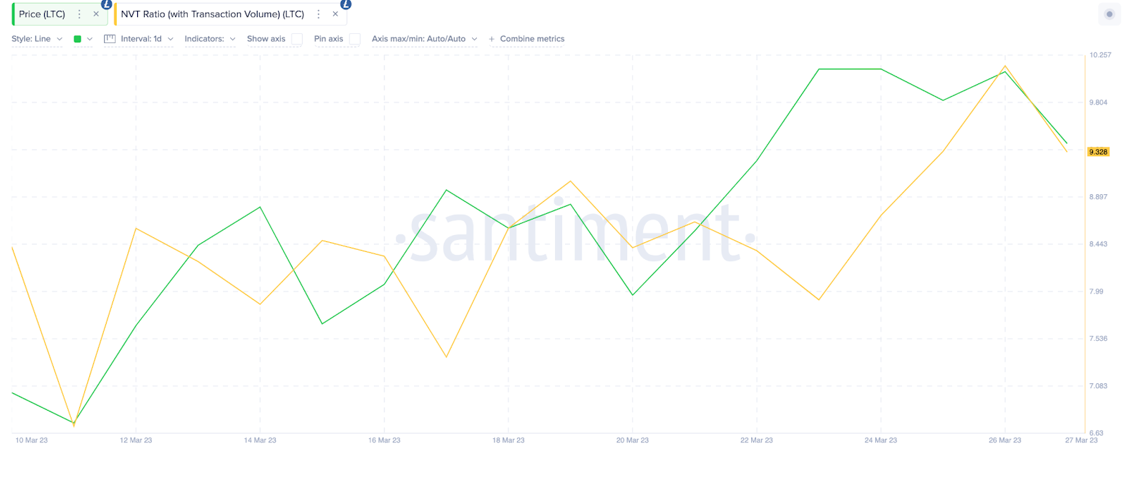 마찬가지로 최근 라이트코인 네트워크의 NVT(거래량 대비 네트워크 가치)가 급증한 것은 LTC에 대한 약세 전망을 입증한다. NVT는 토큰의 시가총액을 일별 거래량으로 나눈 비율을 말한다.
