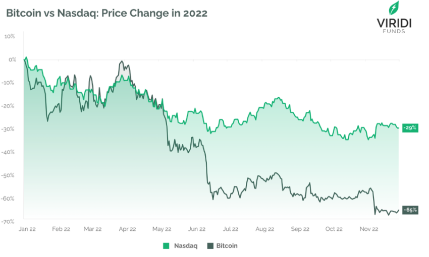 Sponsored Sponsored“긴축 통화 정책으로 인해 2022년은 대부분의 금융 자산이 힘든 한 해였다. 비트코인은 2020년 중반 이후 나스닥과 높은 상관관계를 유지하고 있다. 나스닥이 전년 대비 29% 하락한 상황에서 비트코인이 올해 고전한 것은 놀라운 일이 아니다.”
