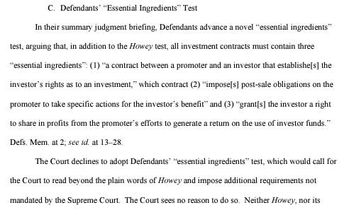하지만 재판부는 “하위 사건 이후 75년 넘는 증권법 판례에서 법원은 피고가 주장하는 ‘필수 요소’가 없는 경우에도 투자 계약의 존재를 인정했으며, 최근 이 분야에서 발생한 디지털 사건에서도 마찬가지였다”고 밝혔다.