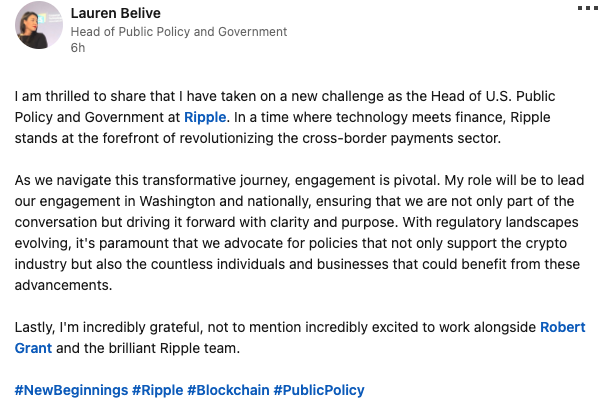 암호화폐 산업의 미래를 결정 짓는 다양한 법률이 미국 의회에 상정된 가운데, 리플(XRP)이 버락 오바마 행정부 때 백악관에서 일했던 로렌 벨리브를 미국 공공 정책 및 정부 책임자로 임명했다.