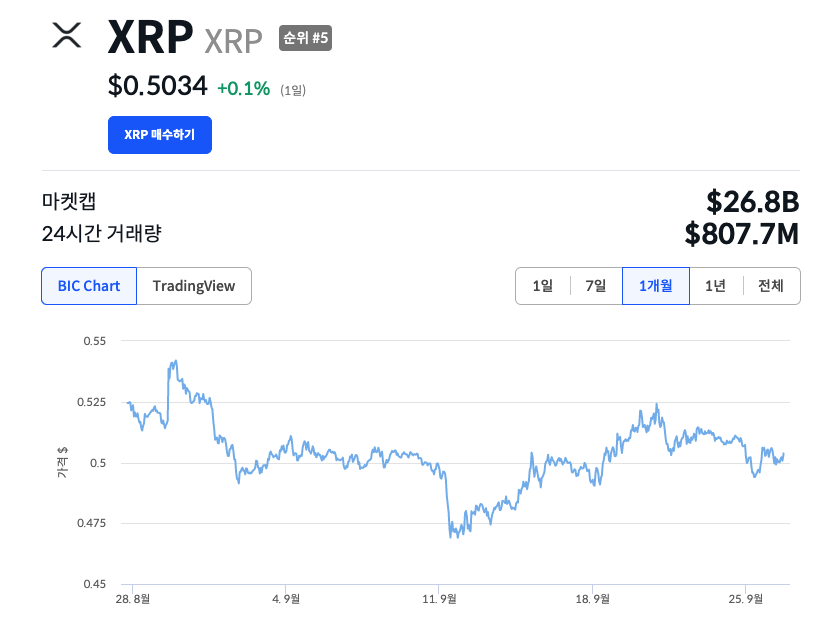 리플은 26일(현지시각) 전날 대비 0.3% 상승해 0.50달러를 기록했다.
