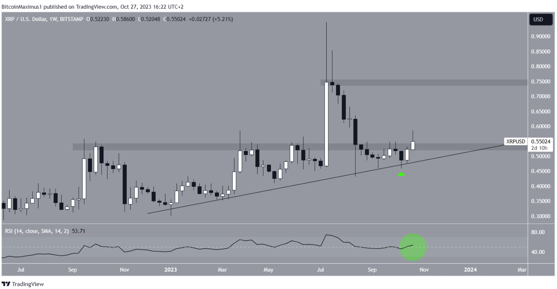 기술적 분석에 따르면 주간 리플 가격은 연초부터 상승 추세를 이어왔으며, 지지 추세선이 잘 형성되어 있는 상황이다. 이 추세선은 여러 차례 하방 압력 테스트를 받았으며, 가장 최근에는 10월 첫째 주 하락에서도 추세를 잘 지키는 모습을 보였다.