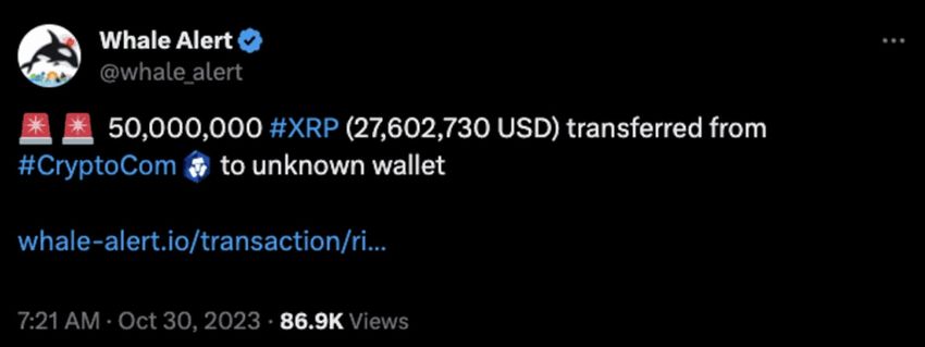 한 거래의 경우 5,000만 개의 XRP로 대략 368억원 상당이 가상자산 거래소 크립토닷컴에서 특정 지갑으로 전송되었다.