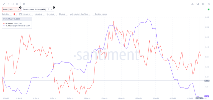 XRP에 대한 약세 전망을 부각시키는 또 다른 요인은 리플 지원 네트워크에서 개발자 활동이 감소하고 있다는 것이다. 지난 3월 20일 기준 개발자 활동은 2월 중순 이후 60% 이상 감소했다.