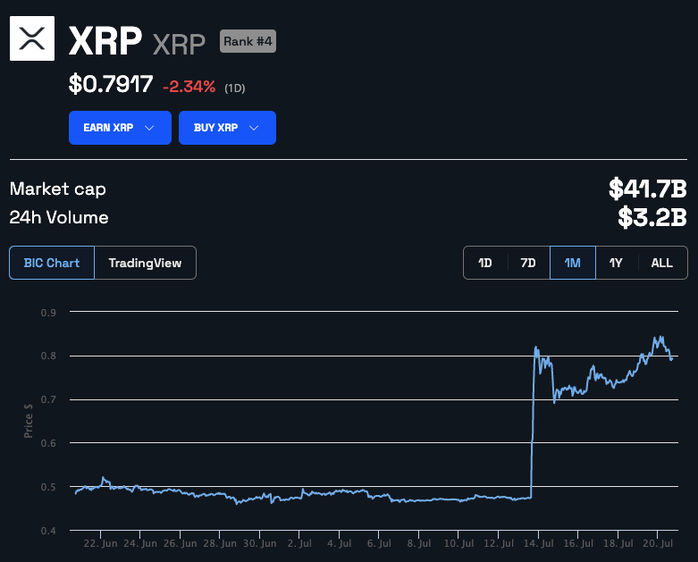 20일(현지시각) XRP 가격은 전월 대비 70% 상승한 0.79달러로, 같은 기간 5% 상승한 전체 암호화폐 시장을 월등히 능가하고 있다.