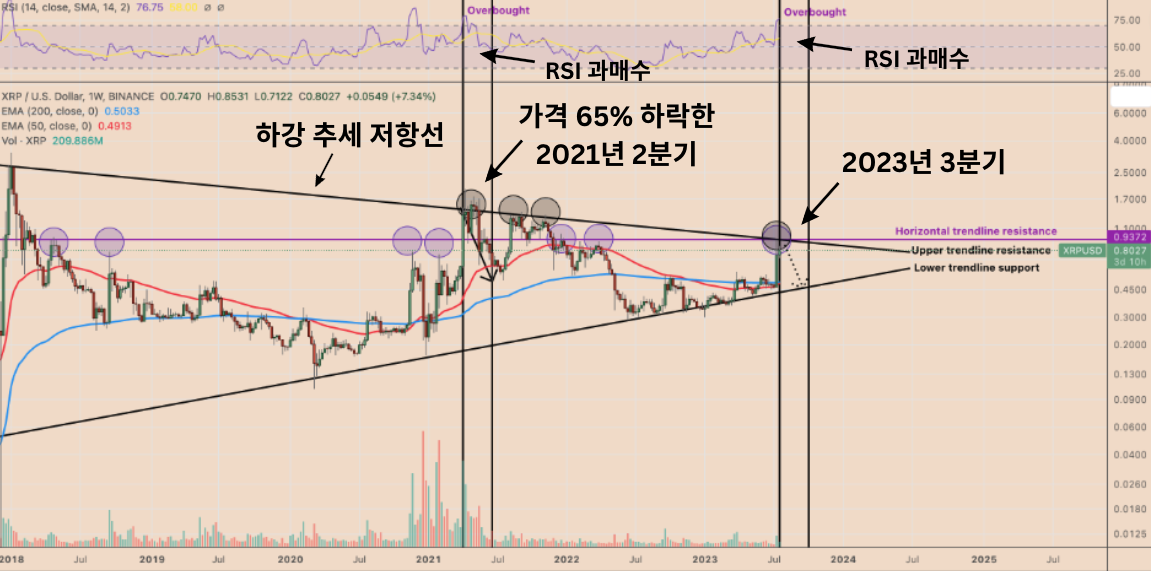 반복되는 패턴을 분석해 시장 가격을 예측하는 프랙탈 분석(fractal analysis)에 따르면, 2021년 2분기 XRP 가격이 65% 하락하기 전, 특정 신호가 XRP에 있었다. 가격 상승이 멈추는 지점인 ‘하강 추세 저항선’이 여러 해 걸쳐 반복해 나타나고, 상대강도지수(RSI)가 과매수를 보였다는 것이다.