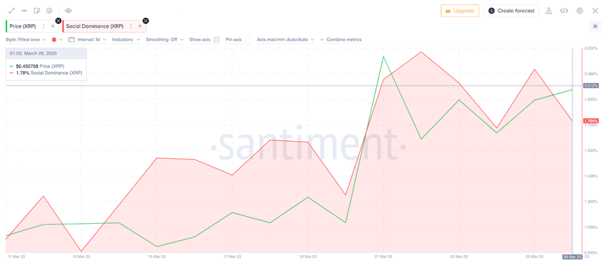 아래 빨간색 선으로 표시된 것처럼, 3월 13~27일 사이에 XRP의 소셜 점유율은 0.94%에서 1.78%로 거의 두 배로 증가했다.