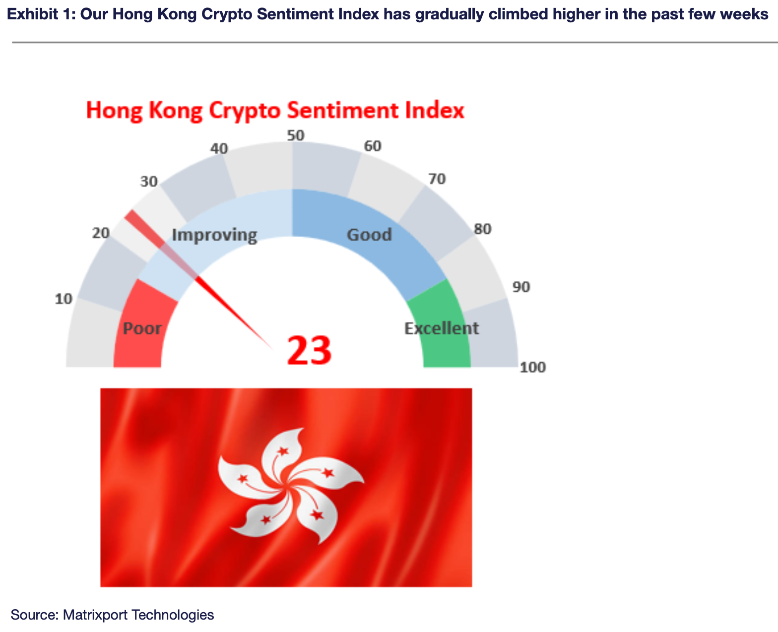 암호화폐 리서치 기업인 매트릭스포트는 지난 6일(현지시간) 리포트를 내고 “여름 내내 정체된 수준이었던 홍콩 투자자 심리지수가 23%까지 상승하고 있다”며 “시장 역학 관계에 분명한 변화가 일어나고 있다”고 밝혔다.