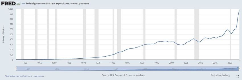Sponsored코베이시레터에 따르면, 지난 5월 부채한도 협상 위기 이후 부채는 1조달러 늘어났다. 과거 5년을 기준으로 보면 총 11조5000억달러의 부채가 추가됐다. 이에 지출되는 연간 이자만 1조달러에 이른다.