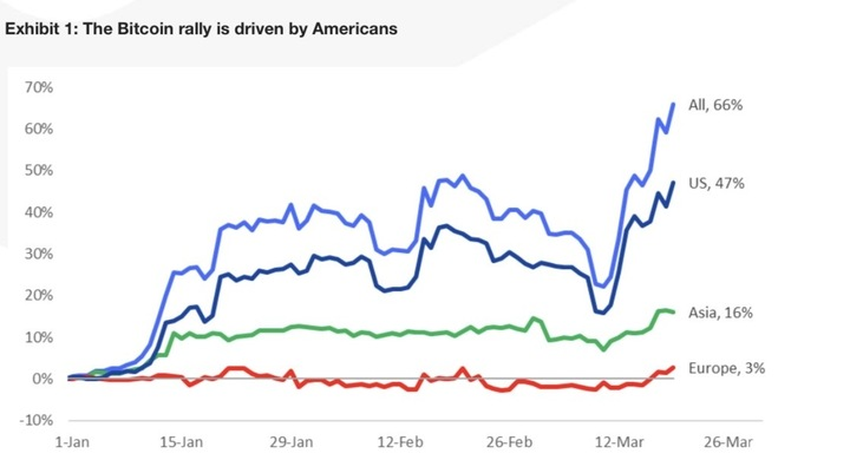 최근 비트코인 랠리를 살펴보면 미국 투자자들이 가격 상승에 큰 역할을 했다는 것을 알 수 있다. 매트릭스포트의 연구 및 전략 책임자 마커스 틸린(Markus Thielin)은 “미국인들이 양손으로 비트코인을 구매하고 있다”고 말했다. 틸린은 비트코인 가격 상승을 이끈 구매 활동의 47%가 미국 기관투자자들로부터 나왔다고 분석했다.