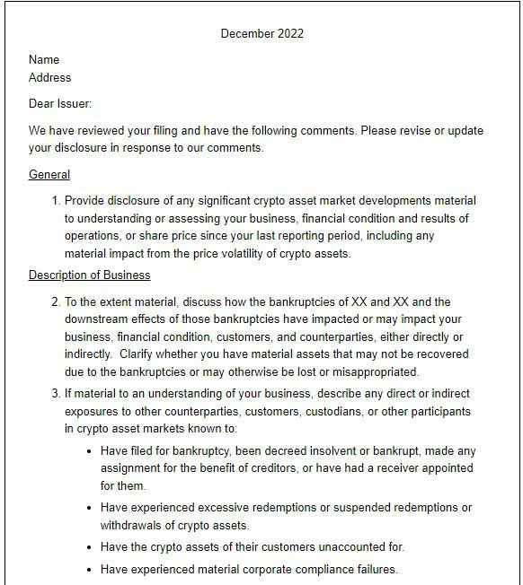 SEC의 기업 재정 부서는 이것이 완성본은 아니지만 기업들에게 해당 형식의 샘플 의견서를 고려하도록 요구했다. 이번 공시 지침에 대해 추가 질문이 있는 기업들은 SEC의 암호화폐 산업 사무소에 문의해야 한다.