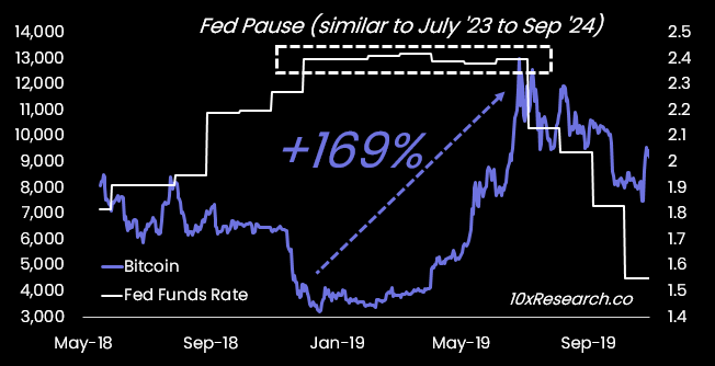 10x 리서치는 이런 통념과는 달리 역사적으로 비트코인 가격이 가장 큰 상승세를 보였던 시점은 연준이 금리인상 사이클을 중단했을 때였다고 설명했습니다. 경제가 기대감으로 한 박자 빠르게 움직인다는 의미입니다. 10x 리서치는 “(금리가 높은 수준에 있다가) 첫 번째 금리인하가 실시되면 비트코인은 미지근한 반응을 보이는 게 일반적”이라고 설명했습니다.
