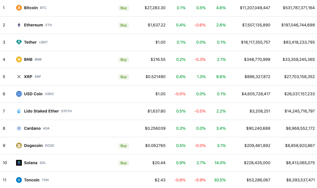 비트코인은 전날 대비 0.5% 상승한 2만 7283달러를 기록했다. 이더리움은 같은 기간 0.6% 하락한 1637달러를 나타냈다. 리플(XRP)는 1.3% 올라 0.52달러, 솔라나(SOL)는 2.7% 상승해 20.4달러에 거래됐다.