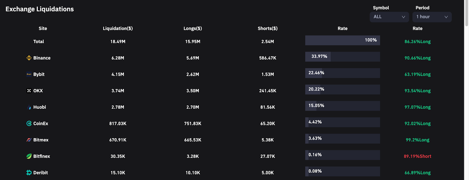코인글래스(Coinglass) 자료에 따르면 50bp 금리 인상 발표 후 1시간 만에 암호화폐 거래소에서 1800만달러 이상의 거래가 청산됐다.