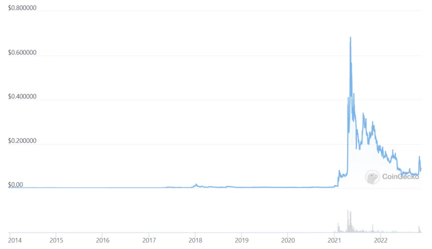 2021년 1월 27일부터 2021년 5월 8일 사이에 도지코인은 0.002달러에서 0.68달러로 10,000% 이상 상승했다.