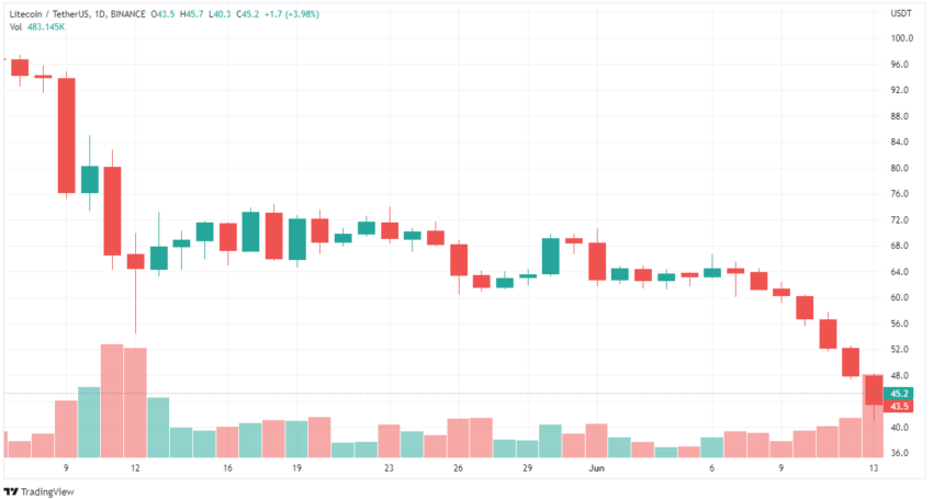 바이낸스 발표 이후, LTC 가격은 11% 하락했으나 작성일 기준으로 45달러 안팎으로 소폭 상승했다.