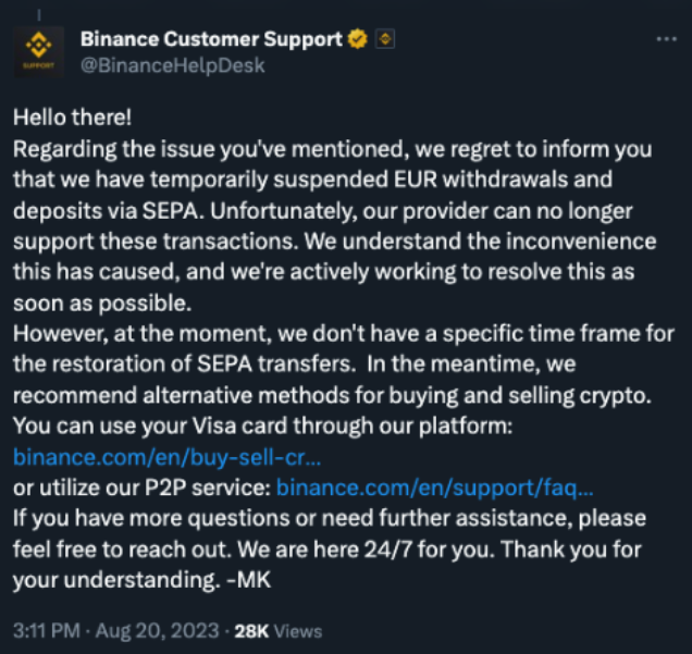 바이낸스가 엑스에 SEPA를 통한 법정화폐 입출금이 중단됐다고 작성했다. 출처:엑스