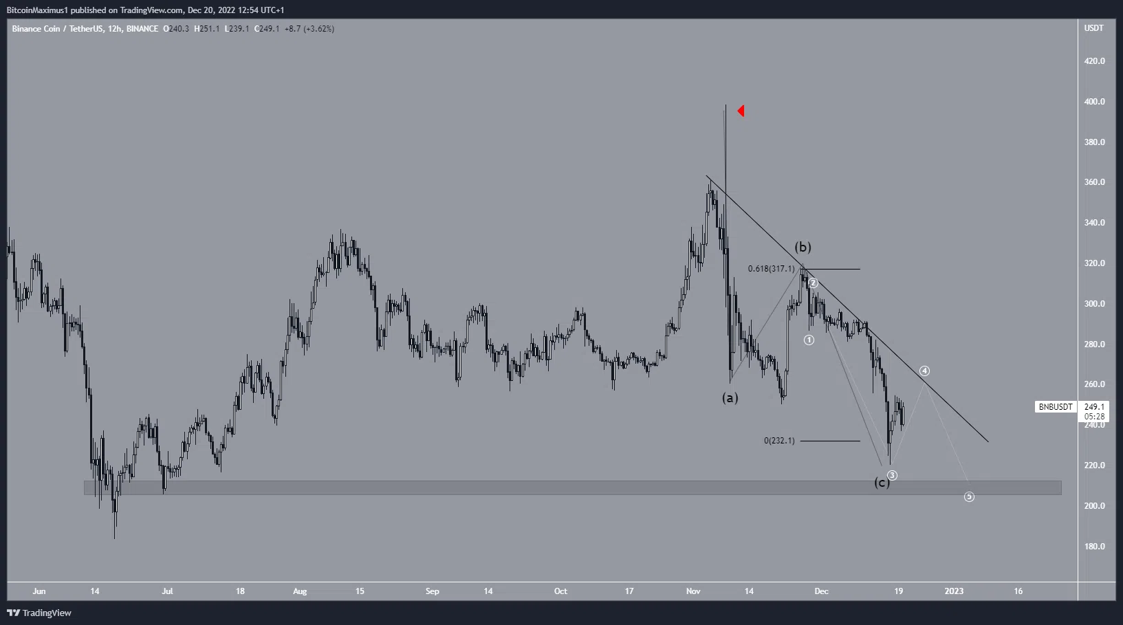 카운트가 맞으면 BNB 가격은 207달러까지 떨어지기 전 저항선에서 하위 4파동을 완료하게 된다. 저항선을 이탈하면 BNB 가격 전망은 무효가 된다.
